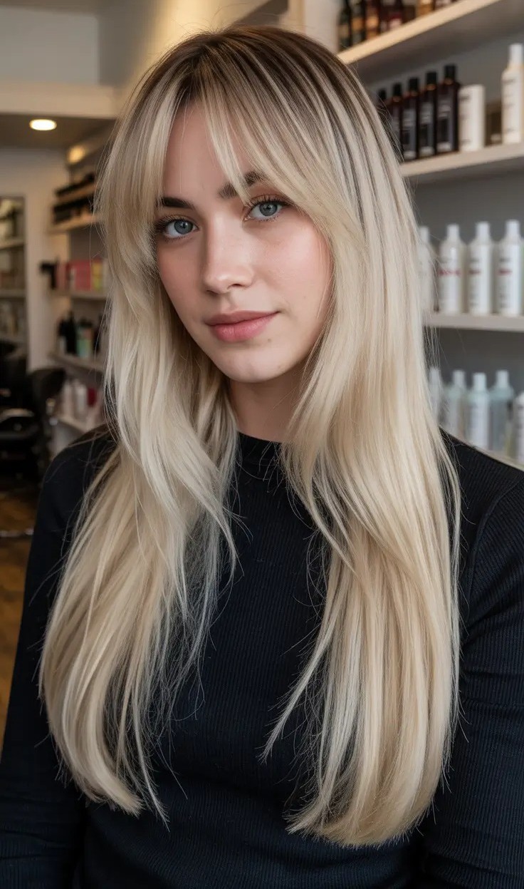 The long curtain bangs frame the face beautifully, softening features while adding a touch of elegance. Layered blonde hair enhances volume and movement which makes it perfect for straight, wavy, or slightly curly textures. This style suits oval, heart-shaped, and round faces, offering a modern vibe. Highlighting the layers with subtle blonde tones creates depth and dimension, ensuring your hairstyle remains effortlessly stylish and eye-catching.