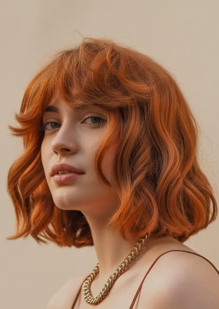 Soft curls add bounce and movement to the bob which gives it a lively vibe. The rose-toned hue brings warmth and a whimsical charm, making the style stand out in any crowd. Ideal for medium to fine hair, this look balances fun and sophistication, offering versatility for both casual and polished styles. The rose color curly bob with curtain bangs is perfect for a bold, trendy, and effortlessly stylish statement.