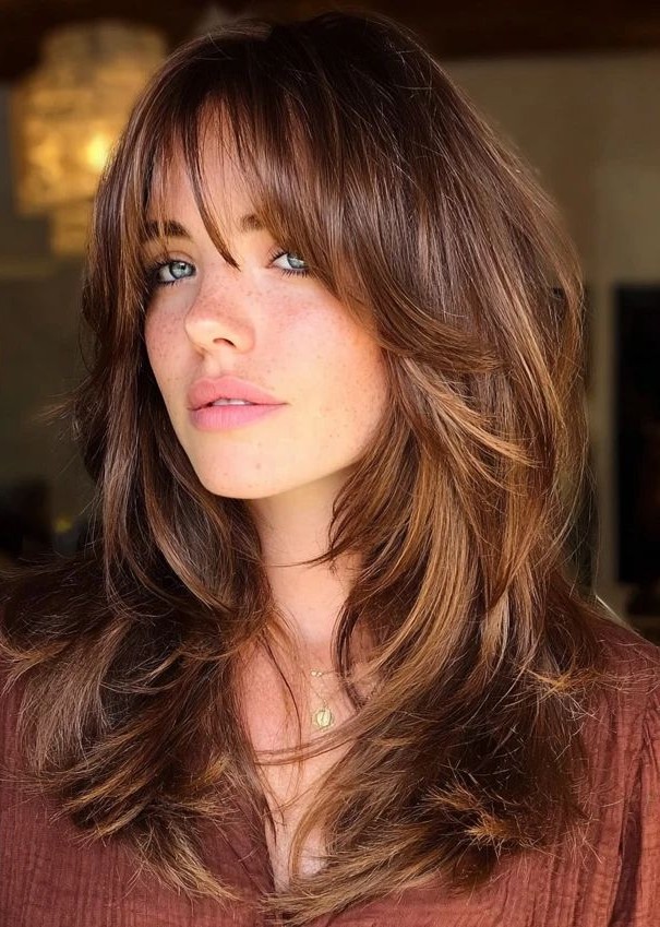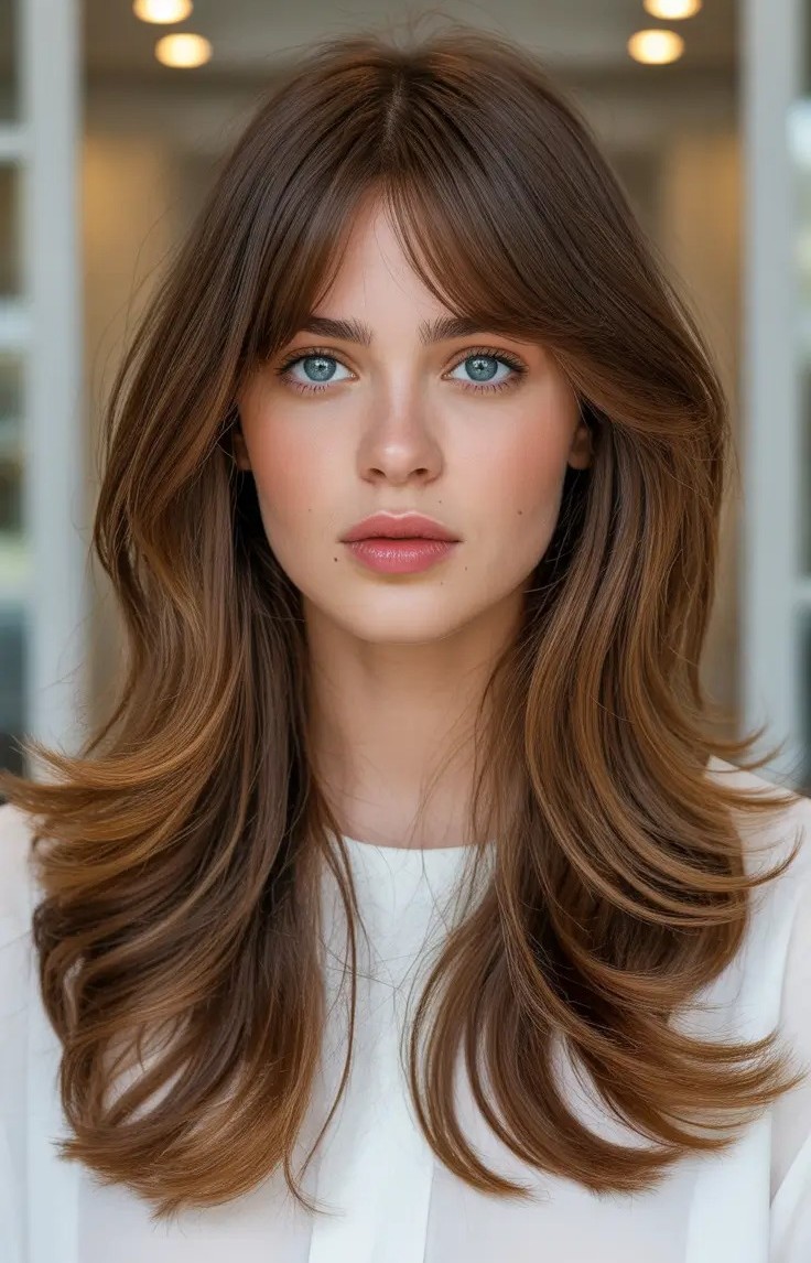Layers throughout the length add natural movement, volume, and dimension while  keeping the hair from looking flat or heavy. Soft curtain bangs frame the face delicately, accentuating the eyes and cheekbones while blending seamlessly with the rest of the layers. Long layered brunette hair with curtain bangs is a timeless choice that flatters all face shapes.