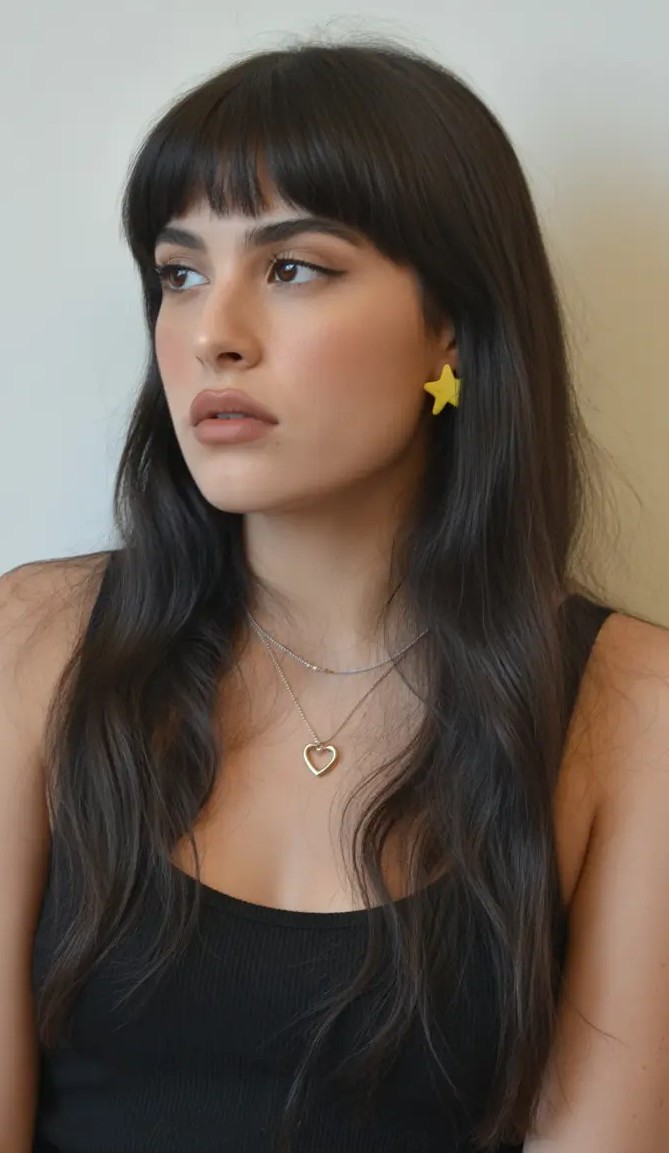 Sleek, jet-black hair flows smoothly down the back while ultra-short micro bangs add a fashion-forward touch. This contrast creates a dramatic focal point, drawing attention to the eyes and forehead. The style works beautifully on straight or slightly wavy hair, maintaining a polished and high-impact look with minimal effort.