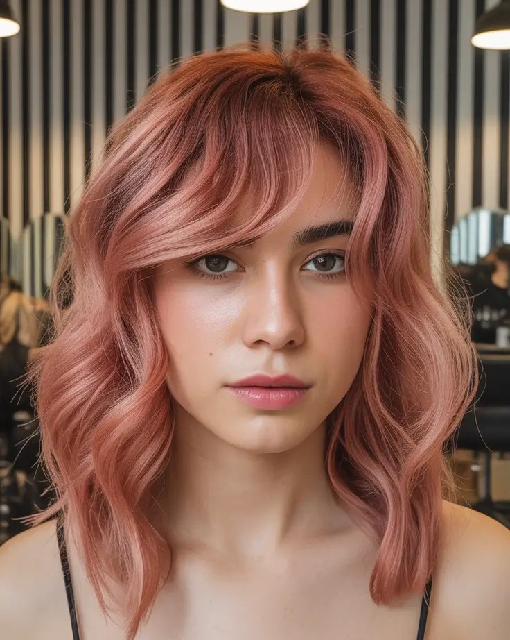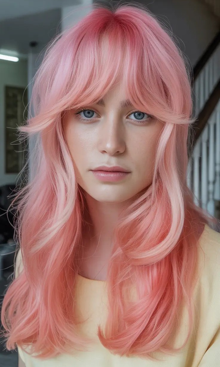It is a playful and dreamy hairstyle that exudes femininity and charm. Soft layers add movement and dimension which allows the pastel pink tones to catch the light beautifully. Curtain bangs frame the face gently, highlighting the eyes and cheekbones while maintaining a soft, romantic vibe.