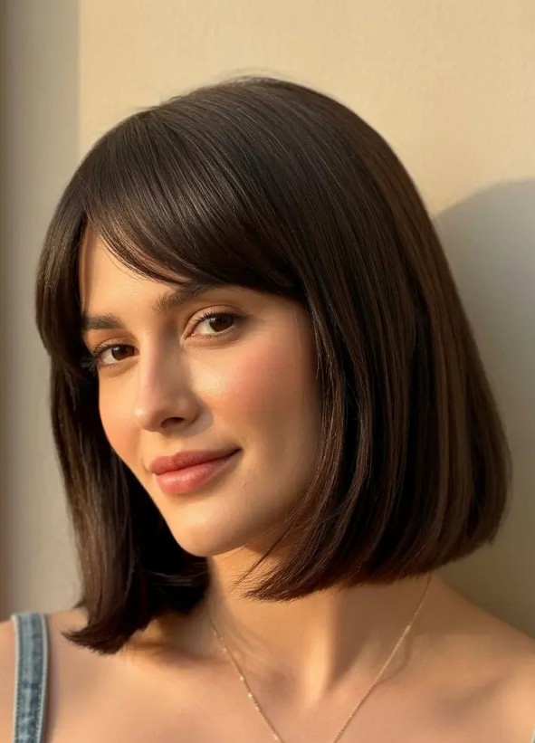 The side-swept bangs frame the face, softening features and adding a flattering dimension. A medium-length bob offers versatility which works well with straight hair. This hairstyle suits most face shapes, particularly oval and heart-shaped, giving a balanced  look.