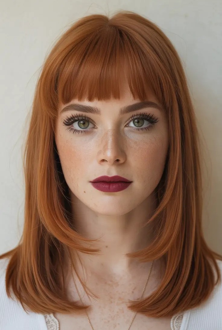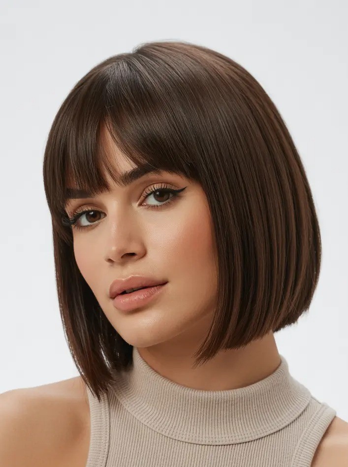 The smooth, straight bob frames the face perfectly while the blunt bangs create a striking, edgy focal point that highlights the eyes and cheekbones. This look works best on straight or slightly textured hair while giving a polished finish. Easy to style yet visually impactful, it’s ideal for both professional settings and stylish outings.