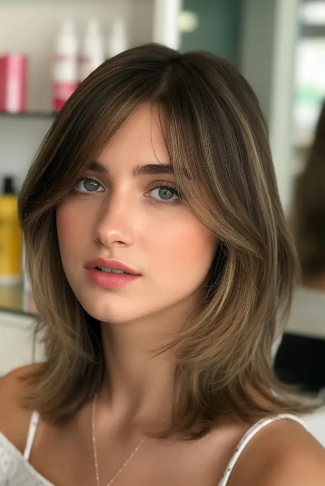 Layers throughout the mid-length hair create natural volume and texture which gives the style a soft and airy feel. Curtain bangs frame the face gently, highlighting the eyes and cheekbones while blending seamlessly with the layers. The medium layered hairstyle with curtain bangs combines elegance, effortless charm, and low-maintenance versatility.