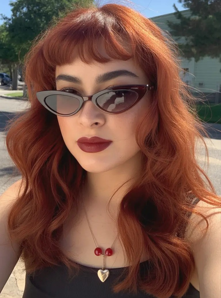 2. Copper Wavy Hairstyle with Baby Bangs