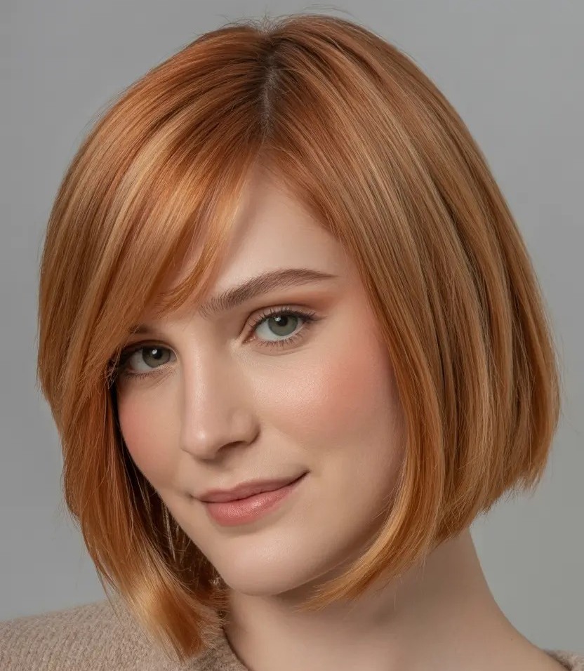 Turn heads with the ginger bob with side-swept bangs, a hairstyle that merges edgy color with flattering structure. Rich ginger tones add dimension and light reflection while the bob cut frames the face perfectly. Side-swept bangs soften the forehead which creates a balanced and youthful appearance. Whether styled sleek or tousled, the ginger bob with side-swept bangs delivers effortless sophistication.