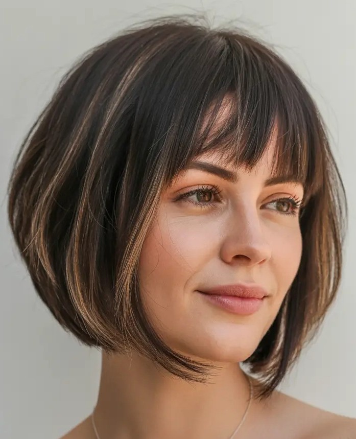 This bob cut features precise layers that add structure while soft highlights bring depth, dimension, and a sun-kissed glow. Paired with ultra-short baby bangs, it creates a bold, fashion-forward statement that frames the face and draws attention to your eyes. The highlighted bob with baby bangs is ideal for anyone seeking a trendy haircut that works for both casual and polished styles.