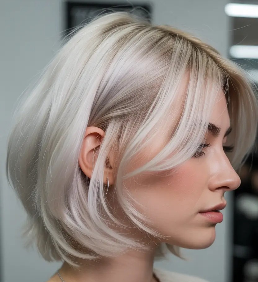 The sleek bob cut enhances facial symmetry while the icy platinum color adds brightness, dimension, and a bold, fashion-forward vibe. Curtain bangs frame the face softly, drawing attention to the eyes and cheekbones while creating a versatile look for all face shapes. The platinum bob with curtain bangs is ideal for trendsetters seeking a chic haircut that balances elegance, texture, and modern glamour effortlessly.