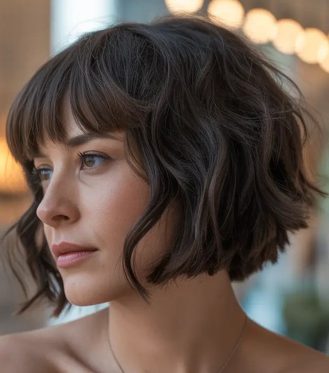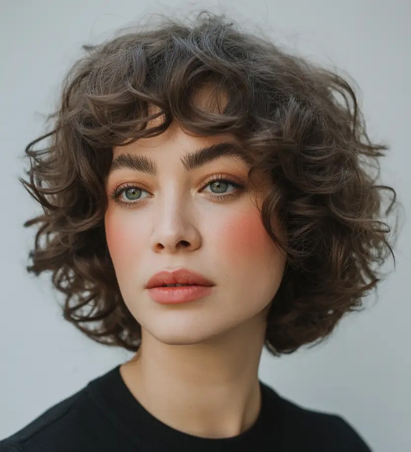 6. Short Curly Bob with Micro Bangs