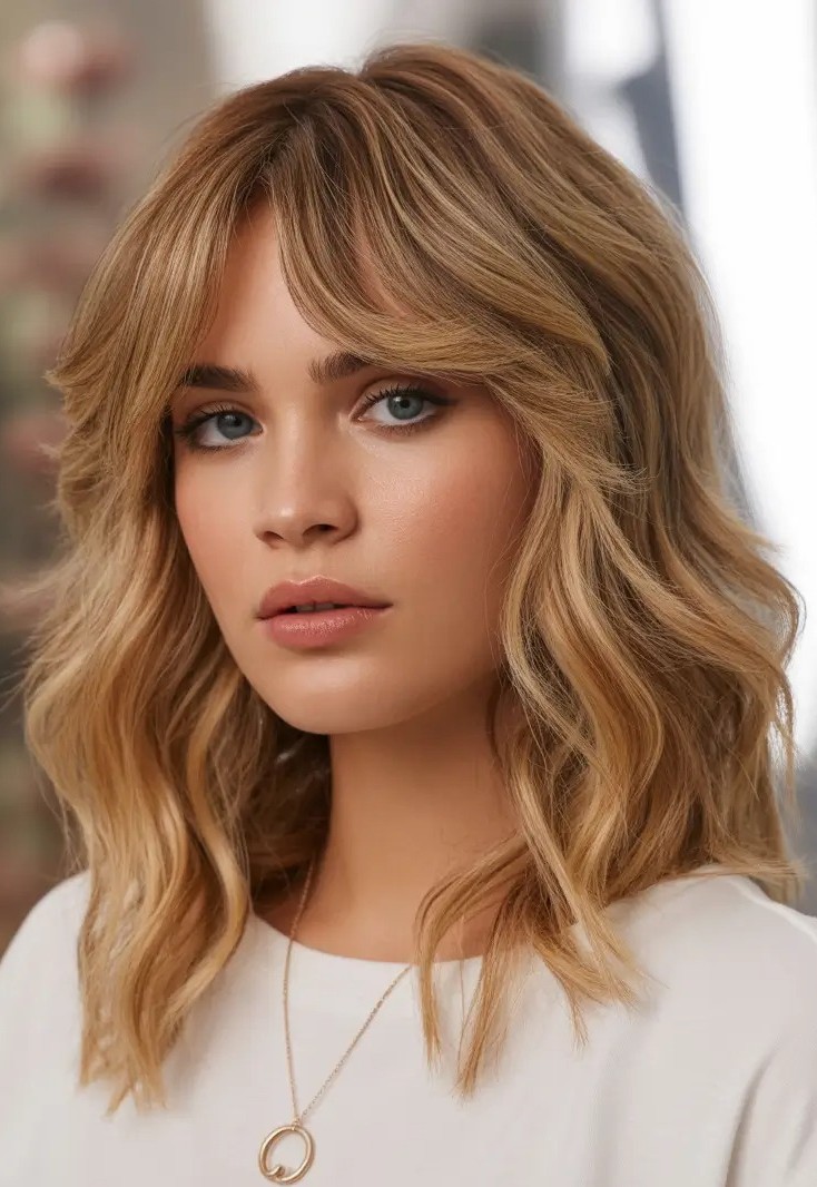 Transform your look with this hairstyle that effortlessly combines elegance and natural movement. Loose, textured waves create a soft, voluminous style while airy bangs frame the forehead and highlight facial features for a flattering effect. Low-maintenance yet eye-catching, wavy hair with airy bangs offers a modern, feminine aesthetic that suits casual days, nights out, or formal events.