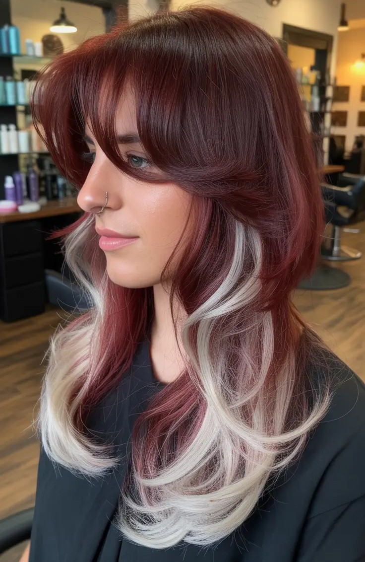 Add a playful yet sophisticated touch with two-tone layers with wispy bangs. This hairstyle features layered cuts that create movement and airy volume while the two-tone color palette adds depth and contrast. Wispy bangs delicately frame the face, softening features and drawing attention to the eyes. Two-tone layers with wispy bangs are ideal for those who want a trendy look that blends dimension, texture, and face-framing elegance for a fresh vibe.