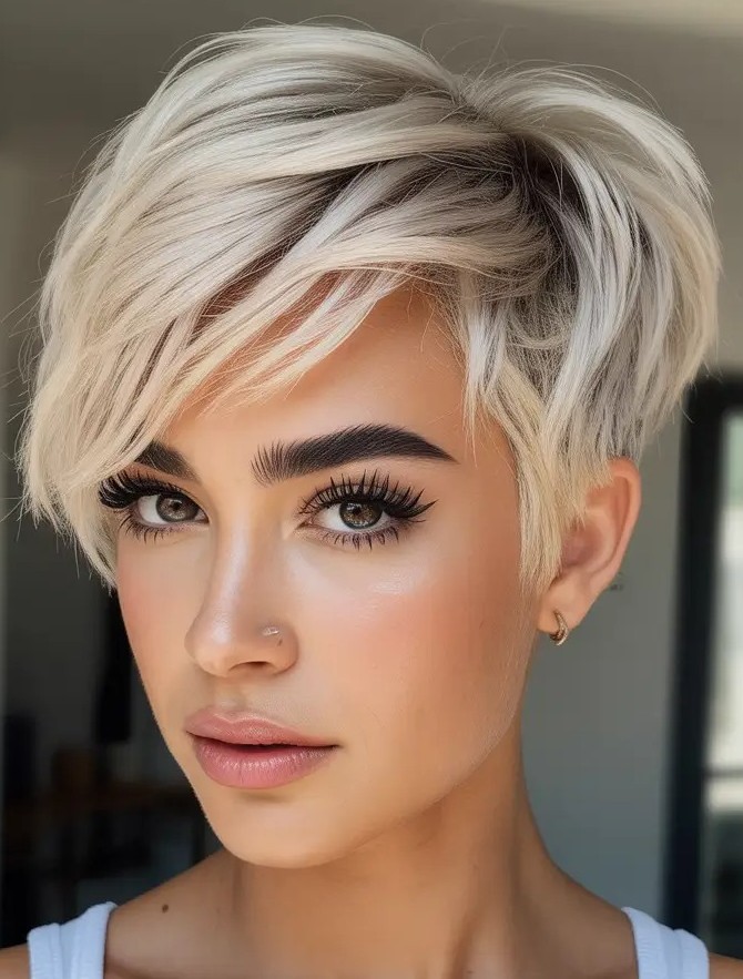 Layering transforms a classic pixie into a modern look which enhances natural hair shape while creating a soft finish. Side-swept bangs or choppy layers can frame the face, highlighting features and adding dimension. This haircut works beautifully on straight, wavy, or fine hair, offering an effortless, low-maintenance style. A layered pixie cut combines sophistication with trendiness while making it a timeless and flattering option for every face shape.