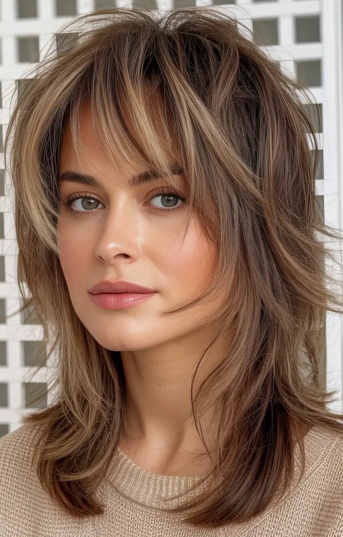 Medium hair with shag layers is a versatile hairstyle that adds texture, volume, and effortless movement. The layered shag creates a soft, lived-in look while making medium-length hair appear fuller and more dynamic. Face-framing layers or wispy bangs enhance features while choppy ends give an edgy vibe. This cut offers easy styling options for everyday wear. Medium hair with shag layers blends classic charm with contemporary flair while making it a go-to choice for a chic and fashionable look.