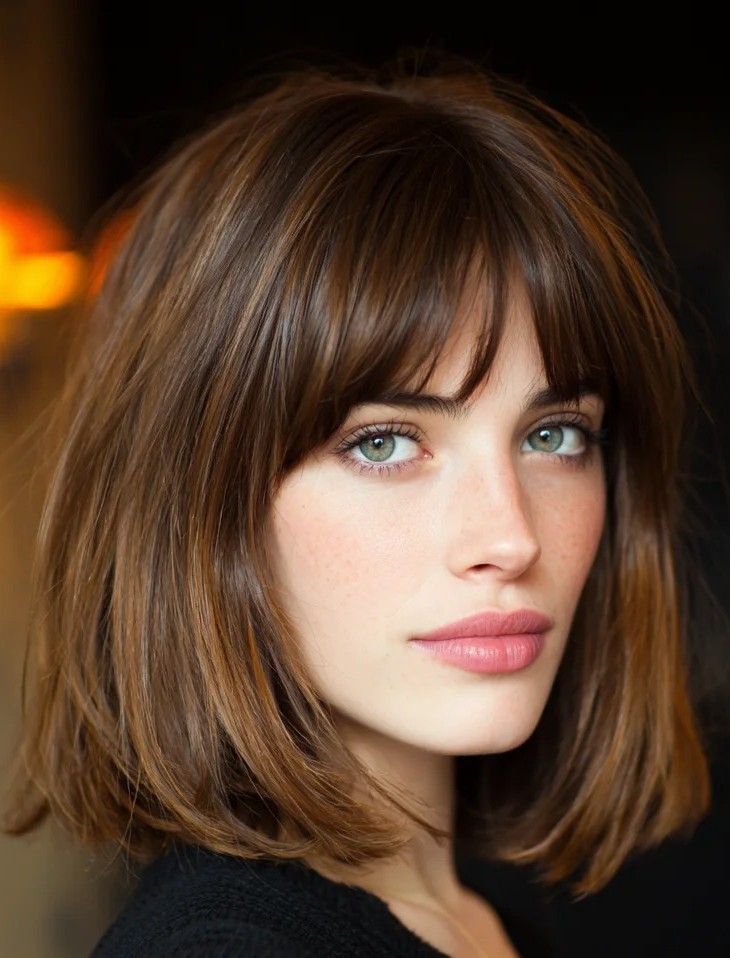 12. Chestnut Lob with Soft Bangs