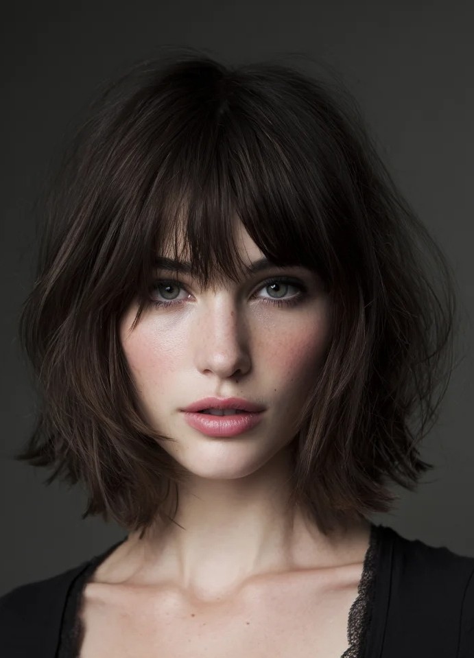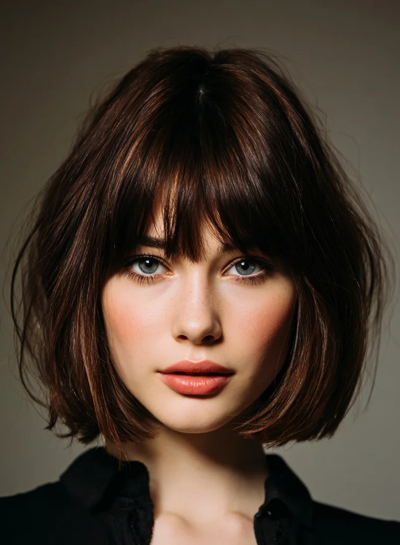 The chin-length bob with blunt bangs is a bold, modern hairstyle that perfectly balances chic sophistication and edgy flair. Hitting right at the jawline, this bob frames the face beautifully, accentuating cheekbones and jaw contours. Blunt bangs add a striking focal point which creates a polished look while softening angular features. It pairs beautifully with sleek straight strands or subtle waves while making it a versatile, Instagram-worthy choice for every occasion.