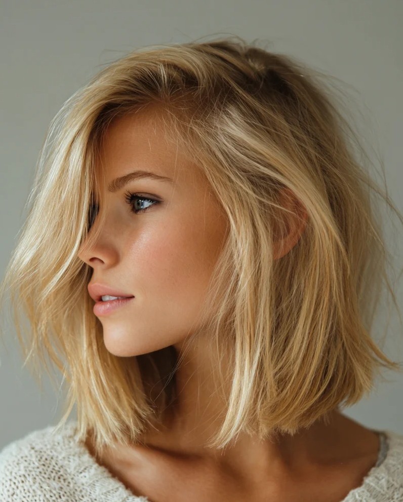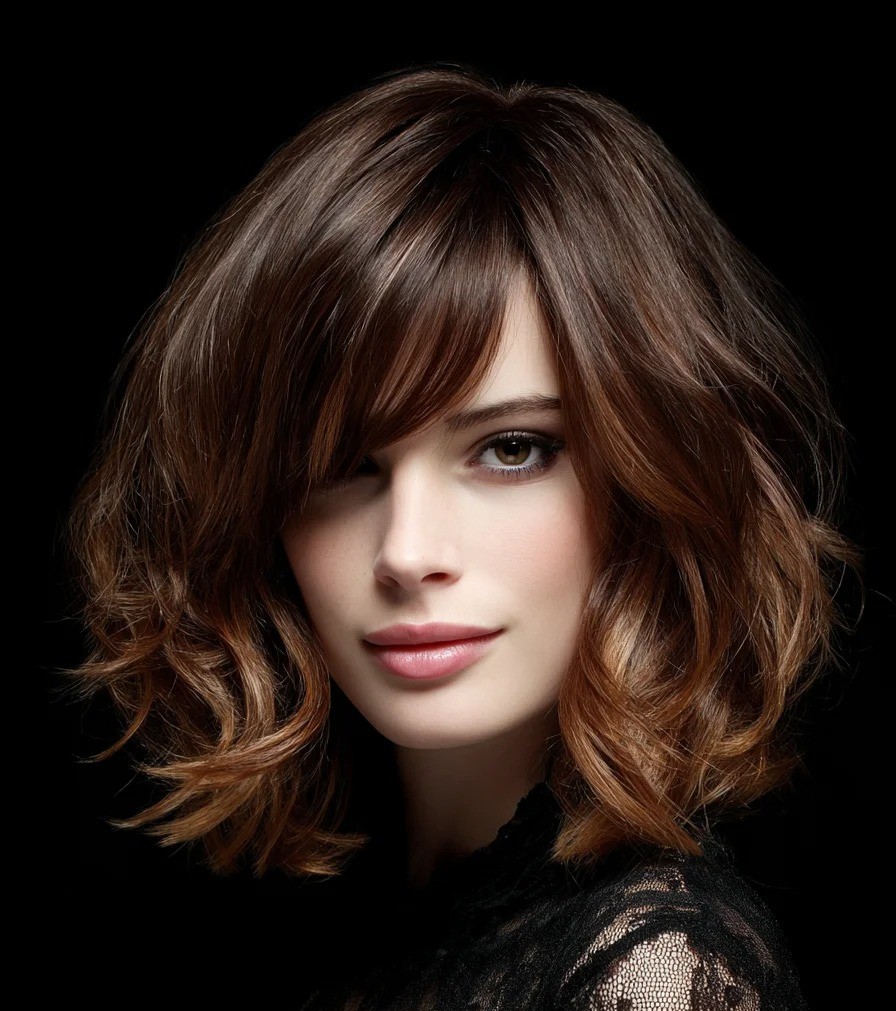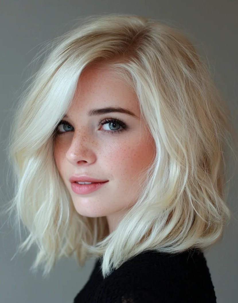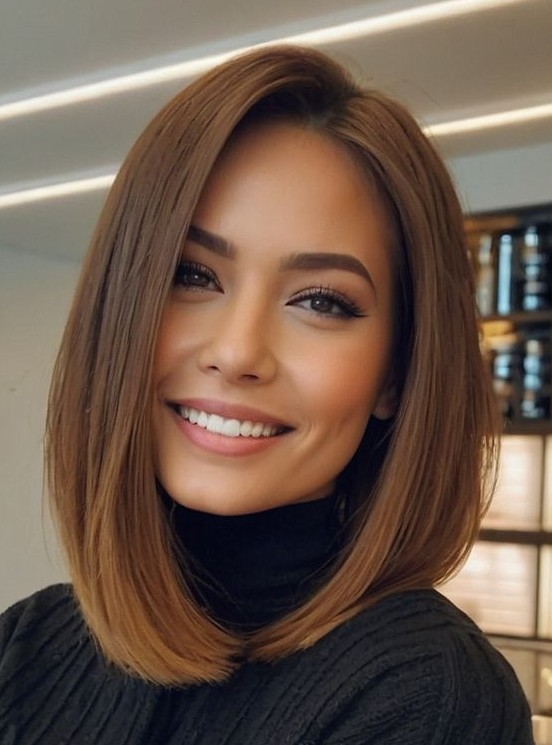 The shoulder-length cut frames the face perfectly while side-swept bangs soften features and add a sophisticated touch. Ideal for straight, wavy, or textured hair, it creates natural volume and movement that can be styled sleek, tousled, or with soft waves. Side-swept bangs are flattering for oval, round, and heart-shaped faces while enhancing features without overwhelming them. This lob is perfect for everyday wear, special occasions, or social media-ready styles.
