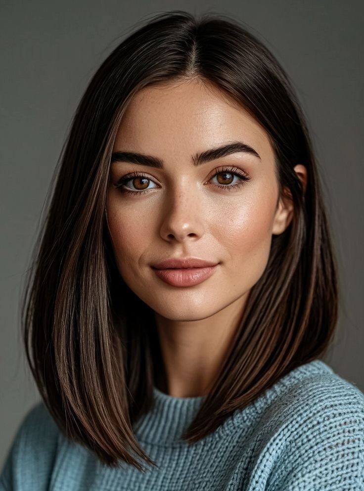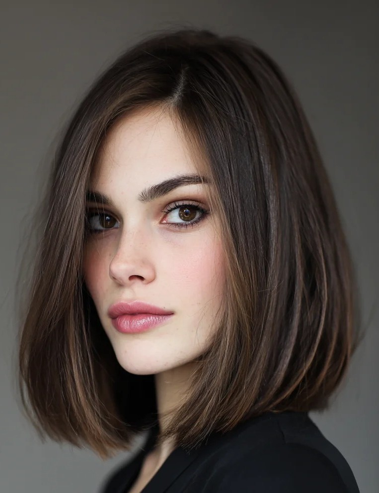 With ends cut straight across at the shoulders, this sleek lob creates a sharp, polished look that enhances facial features and adds a sense of structure. Perfect for straight or slightly wavy hair, the blunt cut emphasizes thickness and healthy shine while making it ideal for fine or medium hair textures. This hairstyle can be dressed up for formal occasions or styled casually for everyday wear. The blunt shoulder-length lob is a versatile choice for anyone seeking a chic aesthetic.