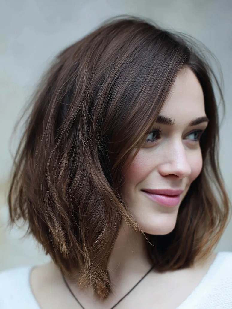 The textured angled lob hairstyle is a must-try for modern hair lovers. The front longer than the back creates a striking, face-flattering angle while textured layers add movement, depth, and body. Perfect for straight, wavy, or lightly tousled hair, this lob adapts to casual, professional, or evening looks with ease.
