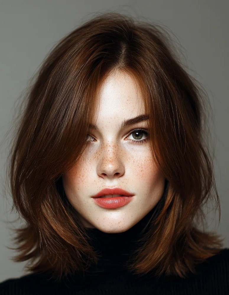 Chestnut lob with soft bangs is a warm, elegant hairstyle that combines timeless sophistication with modern versatility. Falling at or just above the shoulders, this lob frames the face beautifully while soft bangs gently sweep across the forehead, accentuating cheekbones and softening facial features. Rich chestnut tones add depth, shine, and dimension which enhances the natural texture of straight, wavy, or lightly tousled hair.