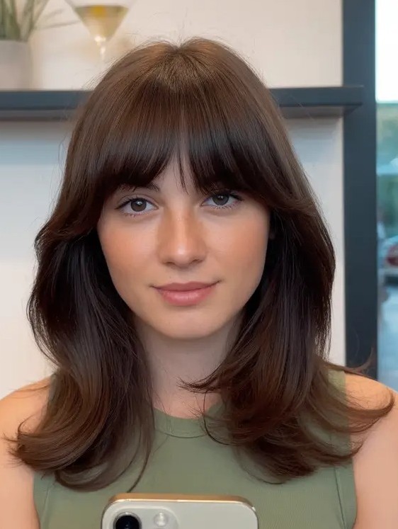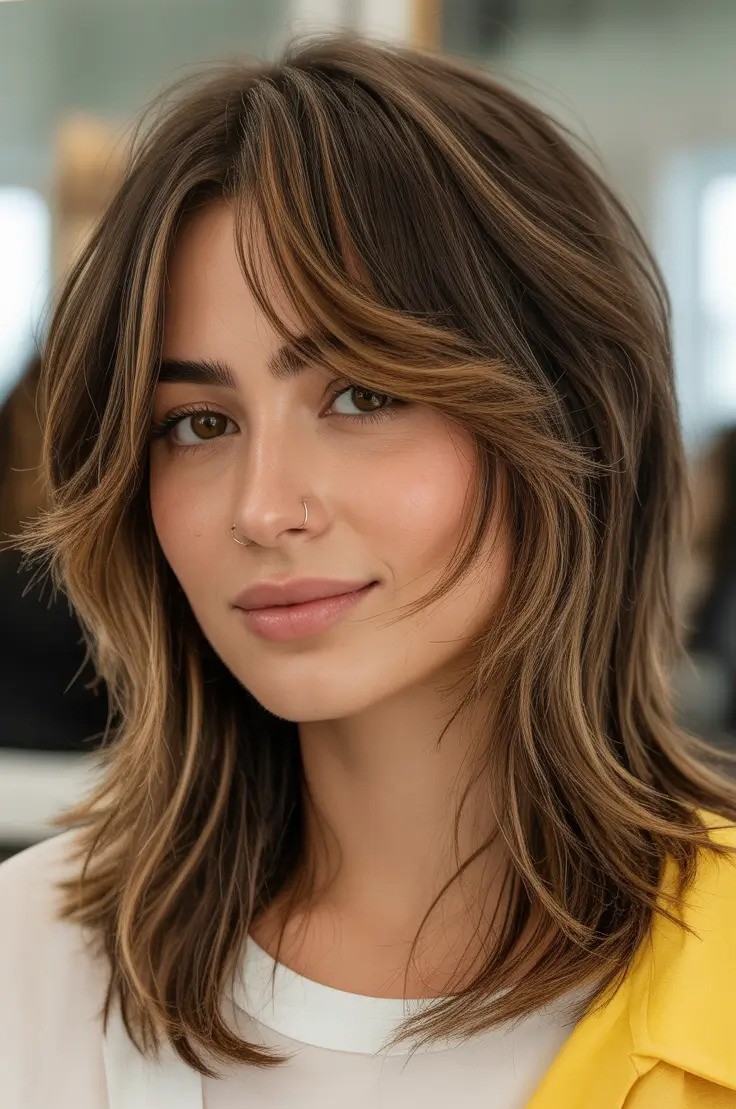 This is a trendy medium-length hairstyle that blends movement, texture, and face-framing elegance. This layered cut features feathered ends resembling butterfly wings while soft curtain bangs highlight the eyes and cheekbones. The butterfly haircut is ideal for women seeking a playful yet sophisticated look, offering versatility for casual or formal occasions.