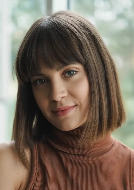 This cut features a smooth, even length that falls around the shoulders, paired with bangs that frame the face and accentuate the eyes. This medium bob offers effortless styling options from sleek and polished for a professional look to tousled for a casual vibe. The classic medium bob with bangs is a go-to choice for a chic, modern, and flattering hairstyle.