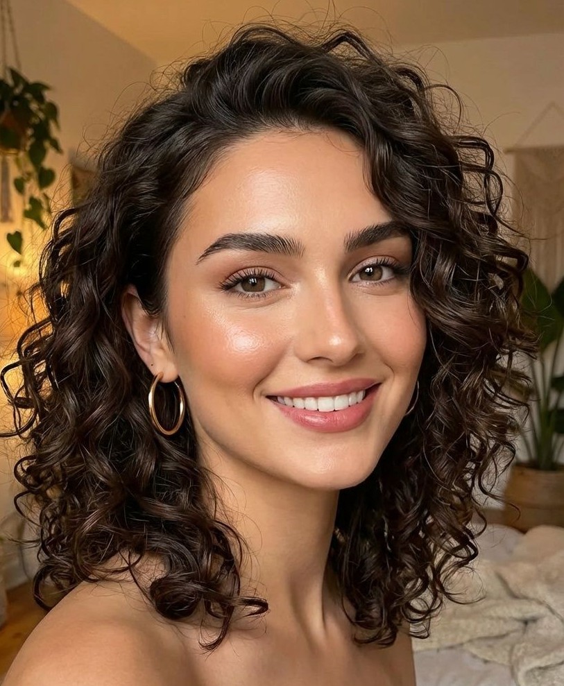 This medium-length cut enhances the bounce and definition of curls which creates a lively and flattering silhouette. Layers can be added to prevent heaviness and ensure movement while face-framing pieces highlight cheekbones and soften features. This style works with all curl types from loose waves to tight ringlets. The curly medium hairstyle offers effortless charm while making it a go-to choice for women who want an eye-catching look.
