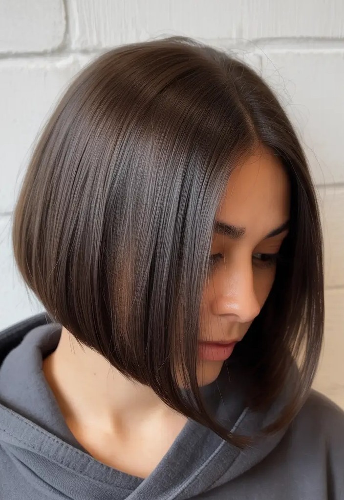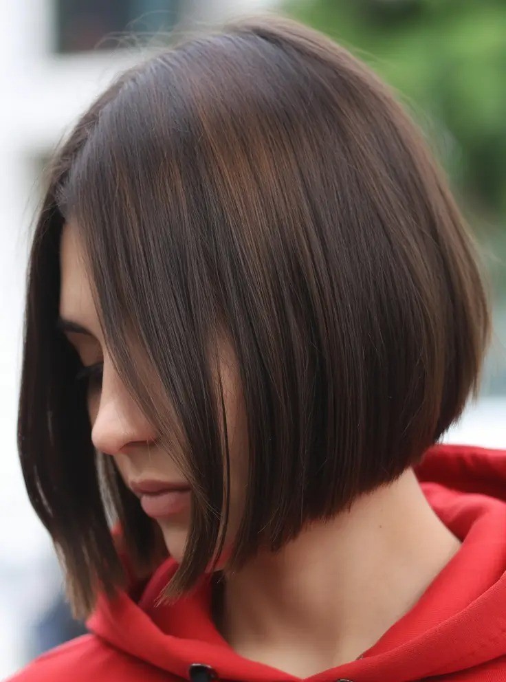 Characterized by a slightly longer front and shorter back, this angled bob creates a flattering silhouette that highlights the jawline and neck. Its sleek, smooth finish adds polish and refinement which makes it perfect for professional and formal settings while still versatile enough for casual looks. This haircut works best on straight or slightly wavy hair and can be enhanced with subtle highlights or a bold color for added dimension.