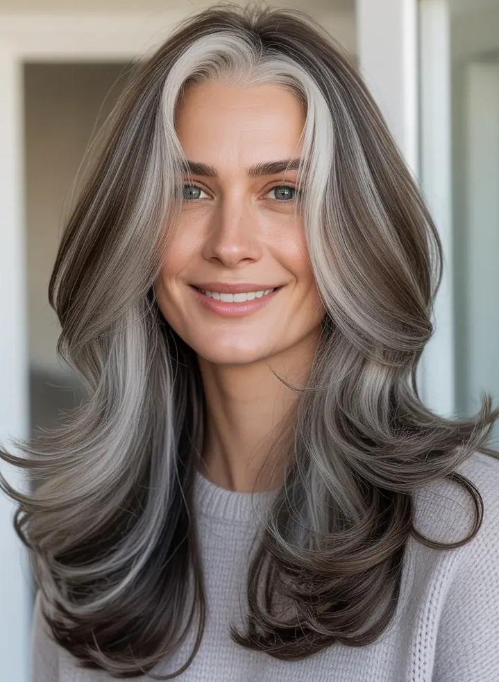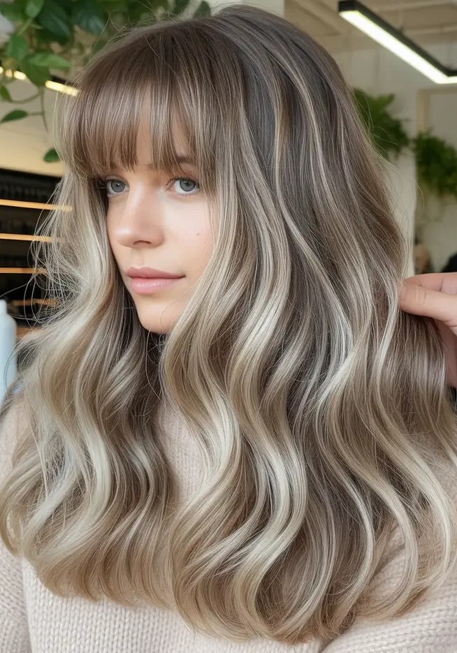 Voluminous mushroom brown hair with buttery highlights is a rich, eye-catching color that blends cool depth with soft warmth. The smoky mushroom brown base creates a polished, modern foundation while buttery highlights add a creamy glow that enhances volume and movement. This contrast makes fine or medium hair appear fuller and more dimensional, especially when styled with layers or loose waves.