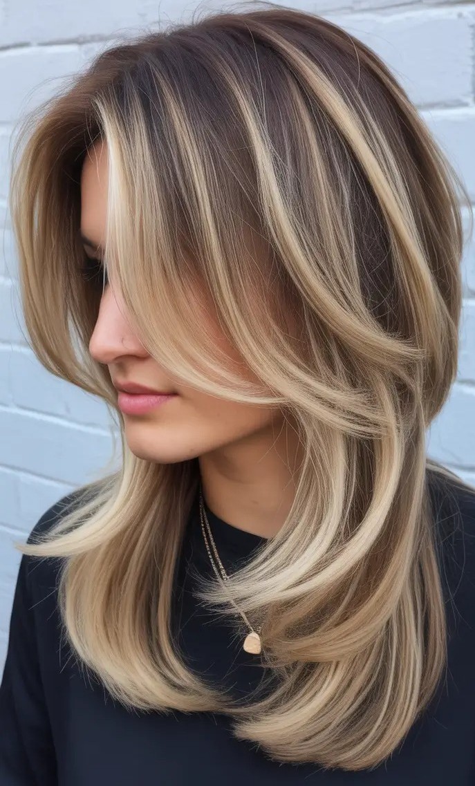 Layered blended mushroom blonde is a multidimensional hair color that combines smoky mushroom brown tones with soft, creamy blonde highlights. The layered cut enhances movement and texture which allows the blended shades to flow naturally from roots to ends. This combination creates depth, volume, and a luminous finish while making hair look fuller and more dynamic. Perfect for neutral to cool skin tones, mushroom blonde offers a sophisticated, modern alternative to traditional blonde shades.