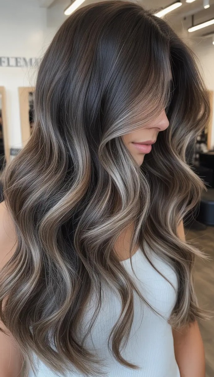 Transform long locks with the elegance of mushroom brown and glossy balayage. The smoky mushroom brown base adds depth while the glossy highlights create subtle, light-catching dimension throughout the hair. This combination brings movement and volume to waves, layers, or sleek strands while giving a naturally radiant finish.