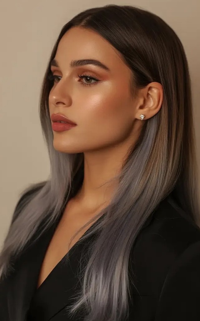 Silver and mushroom brown two-tone hair color is a bold blend that pairs cool sophistication with modern contrast. The smoky mushroom brown base adds depth and richness while silvery tones bring a luminous, icy finish that feels fresh and fashion-forward. This two-tone combination enhances dimension and texture while making it ideal for layered cuts, waves, or sleek styles.