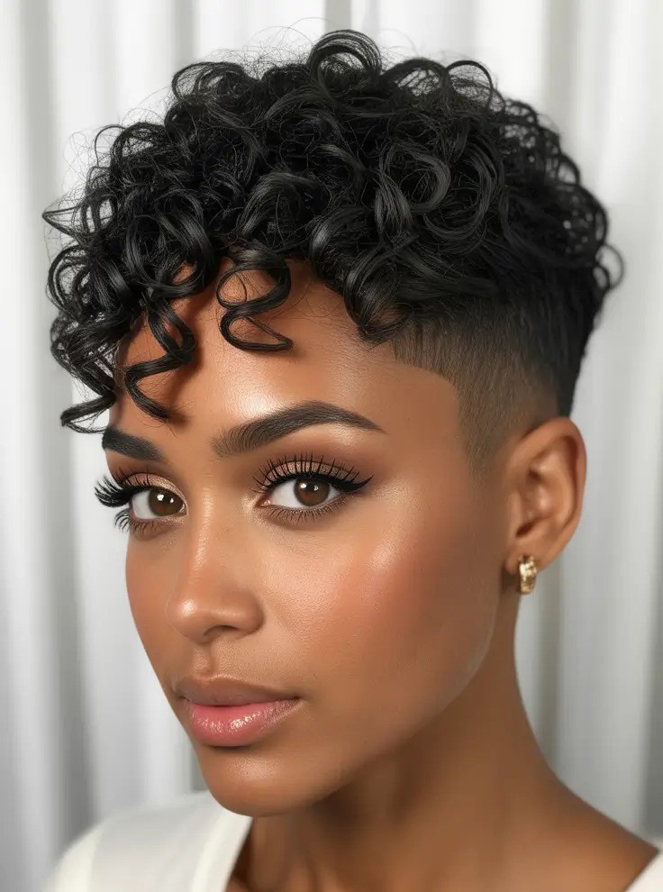 The cropped sides and back combined with longer, curly layers on top create volume, texture, and a beautifully balanced shape. This cut frames the face perfectly, highlighting features like cheekbones and eyes while allowing curls to bounce freely for a youthful appearance. Bold, modern, and effortless, it’s a favorite for anyone embracing natural texture with confidence.