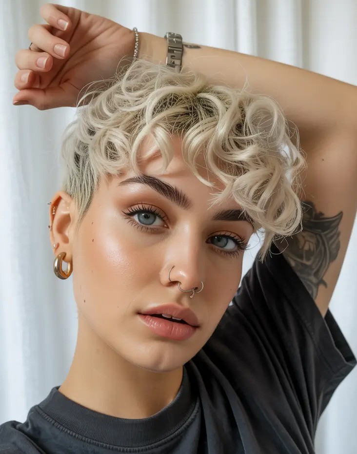 A soft curly pixie with micro waves is a delicate and stylish short hairstyle that enhances natural curls with subtle, defined waves. The micro waves add texture and movement while giving the pixie a soft, romantic, and voluminous look. Perfect for fine to medium curly hair, this style frames the face beautifully, highlighting features like cheekbones and eyes while maintaining an effortless vibe.