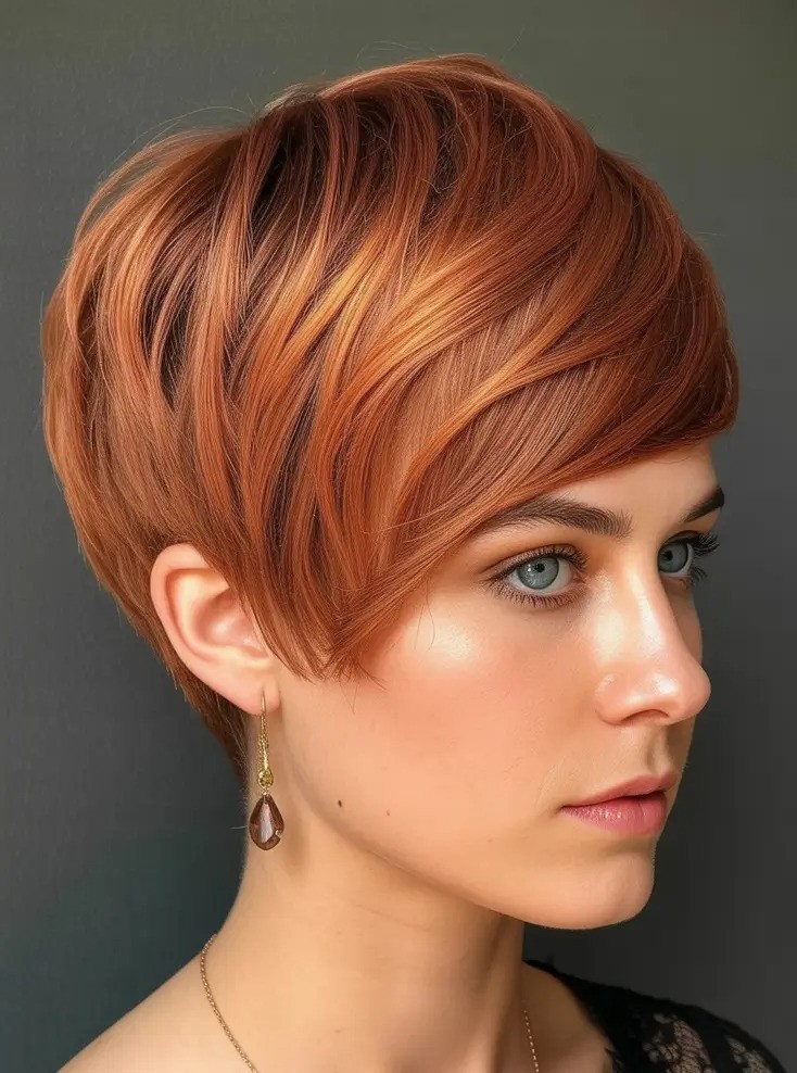 A rose gold layered pixie is a trendy and eye-catching hairstyle that combines soft, dimensional layers with a warm rose gold hue. The rose gold shade brings a subtle blend of pink and blonde tones, creating a modern, feminine glow that enhances the overall look. The rose gold layered pixie is an ideal choice for anyone wanting a chic, fashion-forward haircut with a soft, romantic edge.