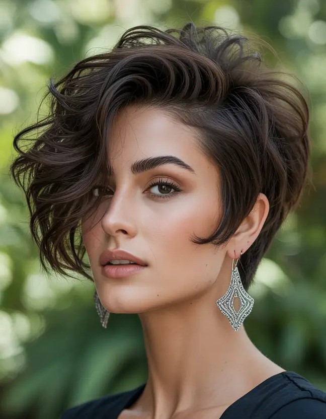 A voluminous wavy pixie is a dynamic and playful short hairstyle that combines texture, body, and movement for an eye-catching look. The waves add natural volume which creates a fuller appearance that flatters fine to medium hair while giving the pixie a soft, feminine touch. With layers strategically cut to enhance the waves, the voluminous wavy pixie is easy to style using minimal products which offers a carefree finish that’s perfect for modern, confident women seeking a bold and textured haircut.