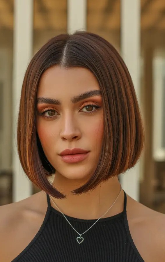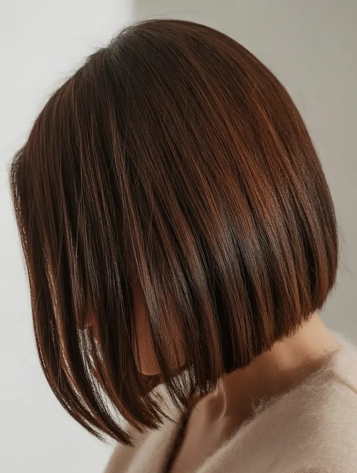 Straight chestnut bob is a polished hairstyle that blends sleek structure with warm and rich color. Falling at the jawline or just below, this straight bob highlights clean, precise lines and a glossy finish. The deep chestnut hue adds natural depth and dimension while enhancing shine and flattering a variety of skin tones. Its simplicity makes it perfect for both everyday wear and sophisticated occasions while the sharp cut keeps it modern and refined.