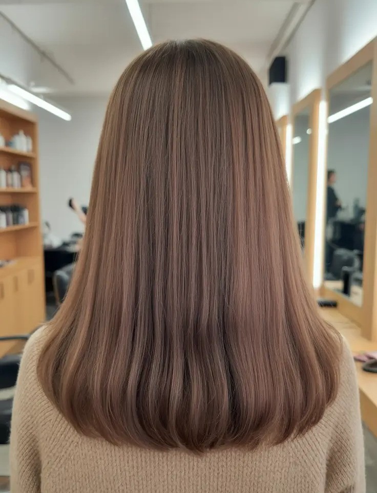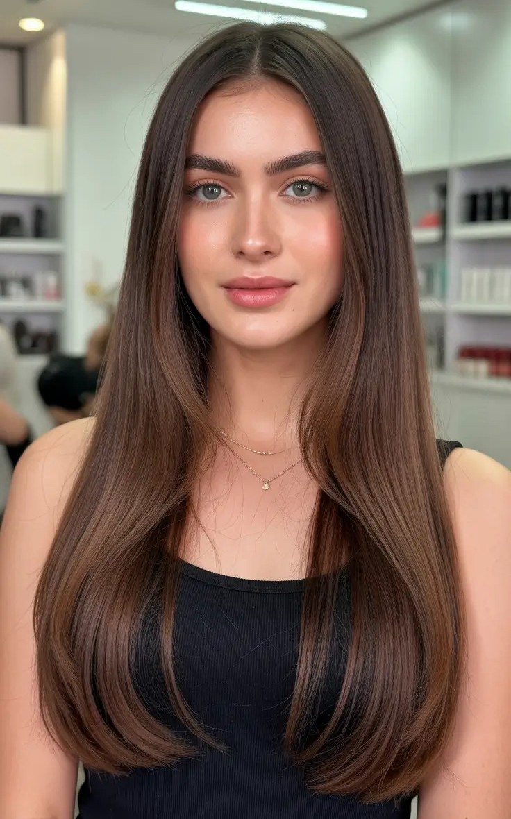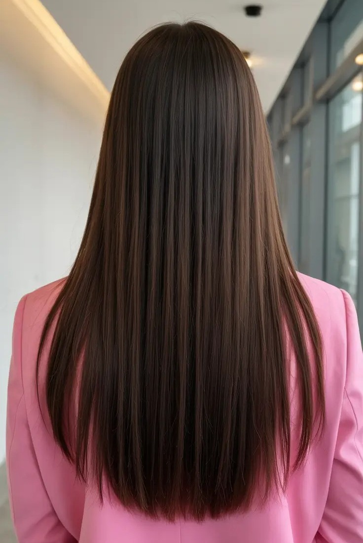 Hair flows gracefully past the shoulders in straight, smooth strands with a glossy, mirror-like finish. Its clean simplicity highlights healthy, well-maintained hair while making it ideal for both everyday wear and special occasions. Perfect for medium to thick hair, this style pairs effortlessly with a center or side part, framing the face while keeping a streamlined silhouette.