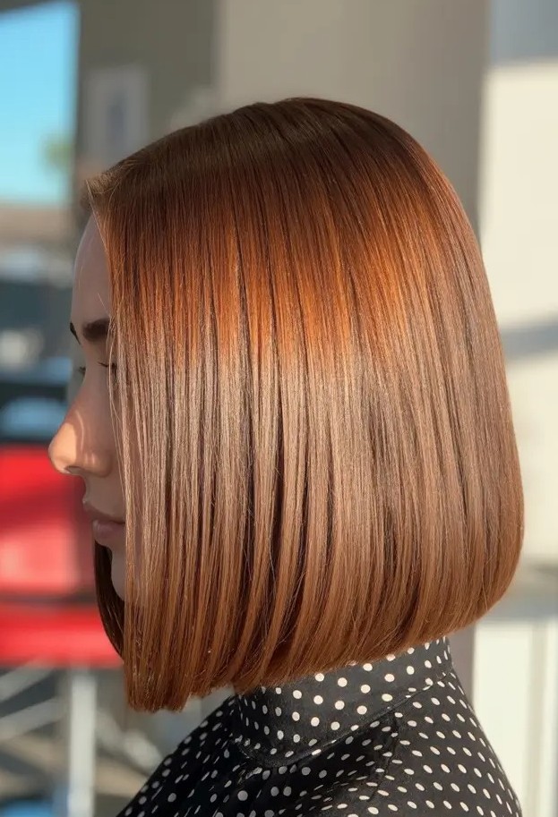 The straight copper precision bob is a bold, ultra-sleek hairstyle that blends sharp structure with rich warmth. This chin-length cut features perfectly even, blunt ends that create a clean, modern silhouette. The vibrant copper shade adds depth and dimension while making straight hair look glossy and full of life. Ideal for fine to medium hair, the precision bob enhances thickness while maintaining a polished finish.