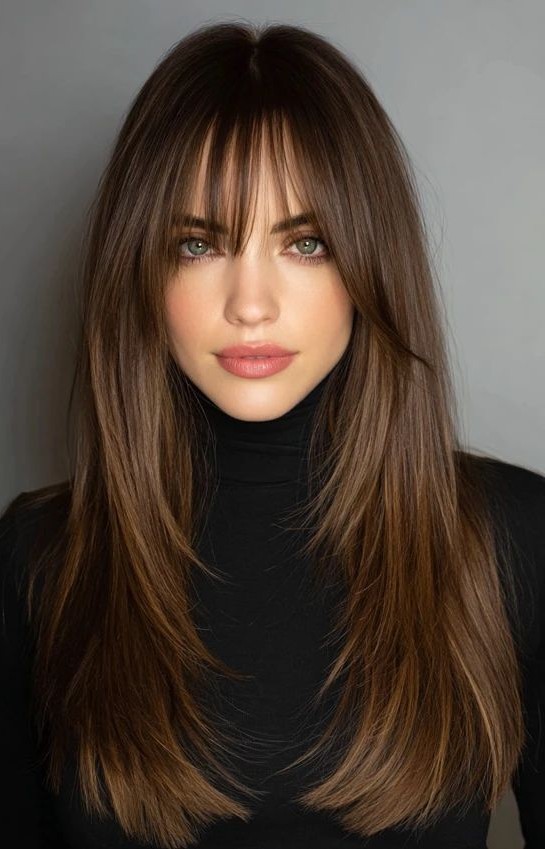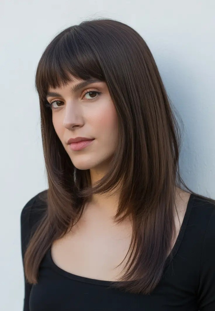 Shoulder-length layers create dimension and prevent the hair from appearing flat while soft bangs gently frame the face. The straight texture keeps the style polished and refined, perfect for everyday wear.