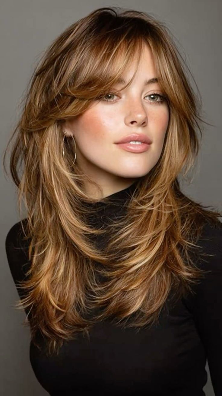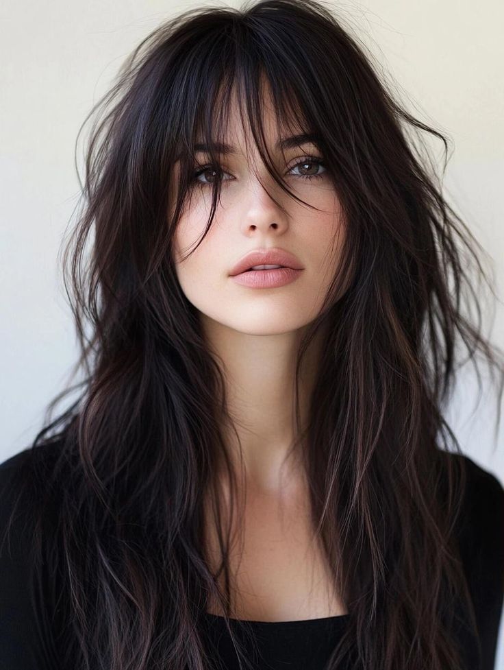 Side-swept curtain bangs add drama to the traditional shag. This style emphasizes movement around the face while maintaining the length in place. Long layers cascade effortlessly, blending into bangs that sweep softly to the side.