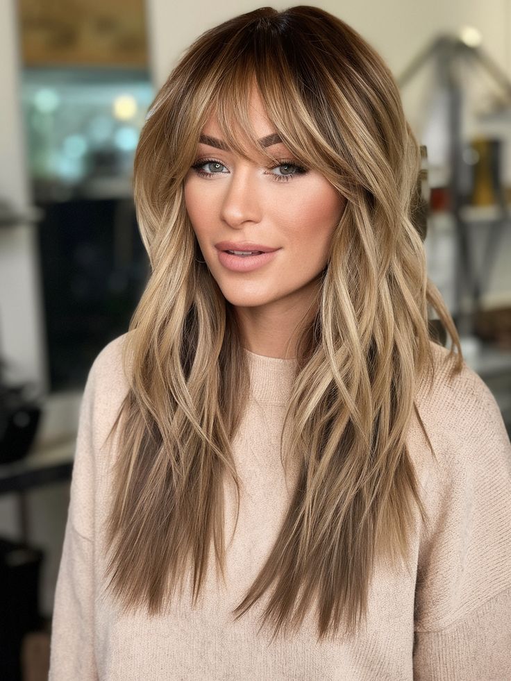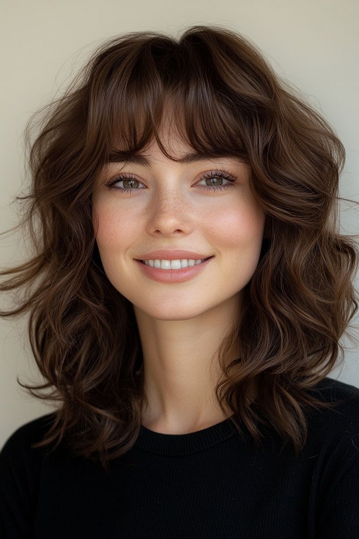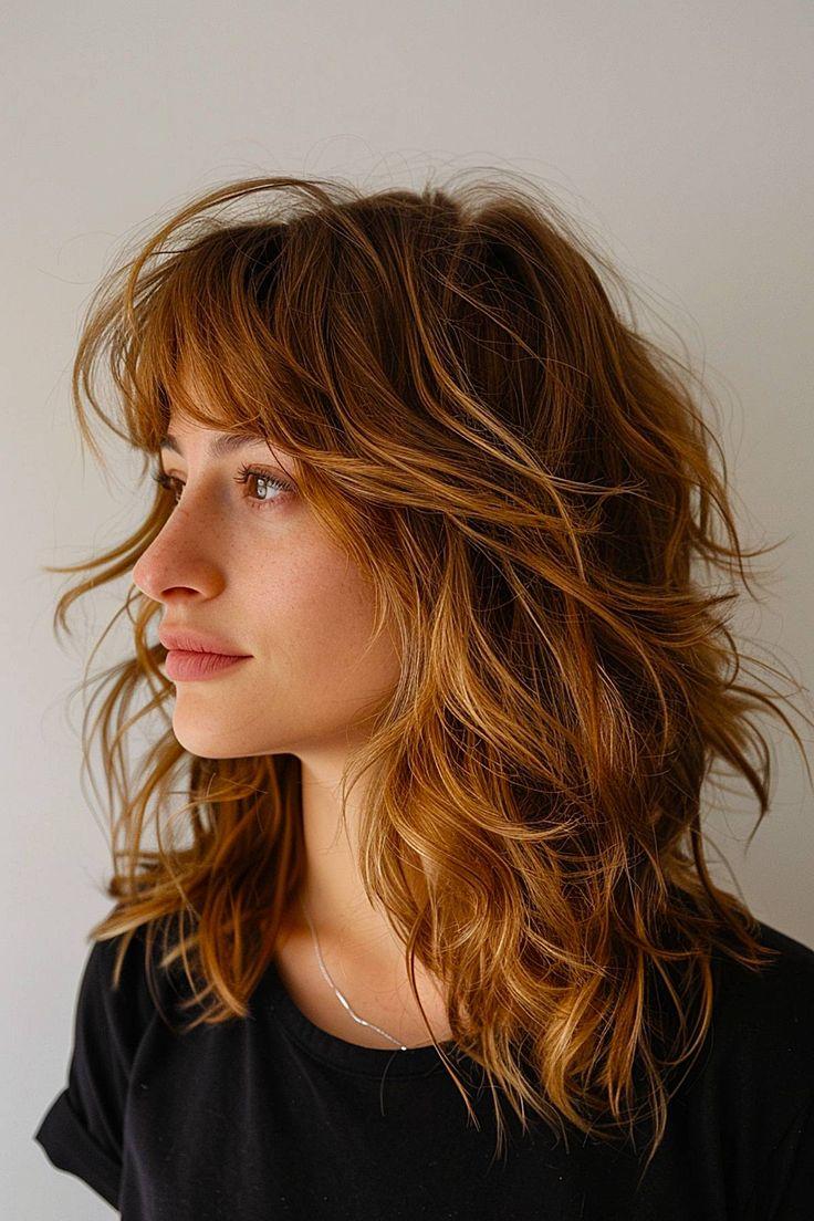 Long side-swept bangs are a softer alternative to full fringe. Blended into shaggy layers, they add movement without demanding excessive upkeep. This look is versatile for both professional and casual settings.