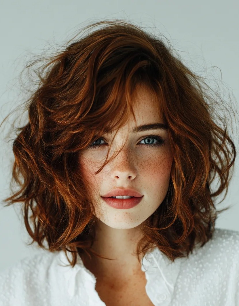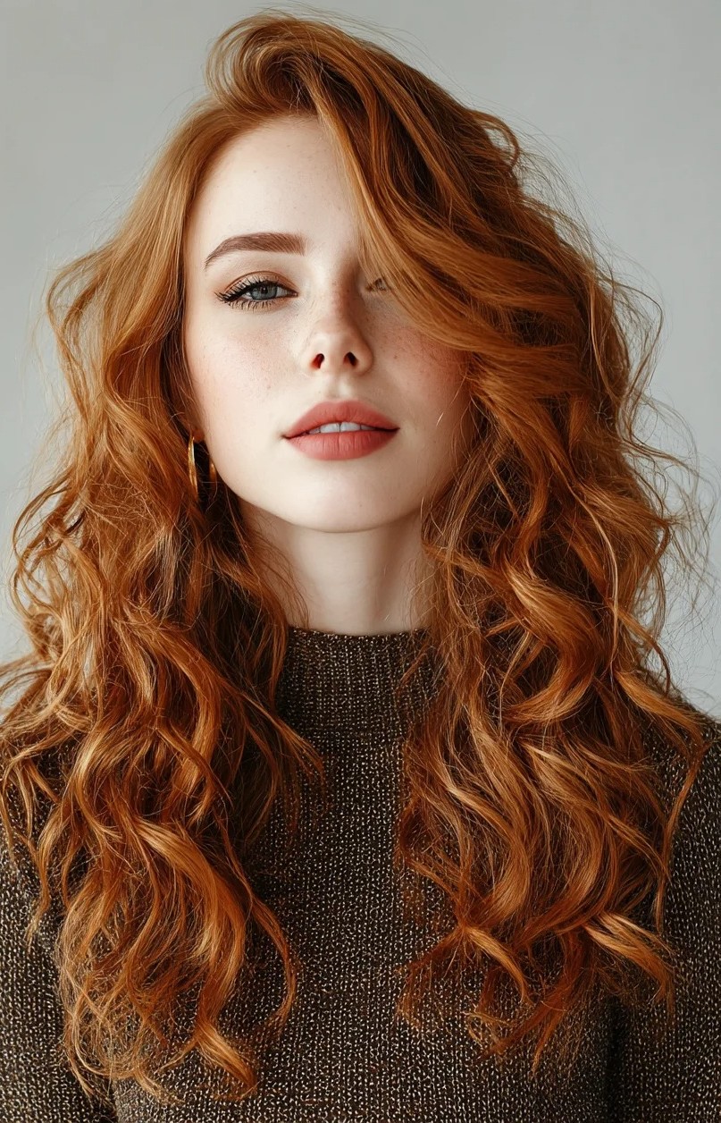 A copper wavy hairstyle with face‑framing layers is a vibrant, eye-catching look full of movement and dimension. The warm copper tones enhance natural waves while creating a rich and luminous shine that catches the light beautifully. Perfect for medium to long hair, this style blends effortless glamour with a modern vibe.
