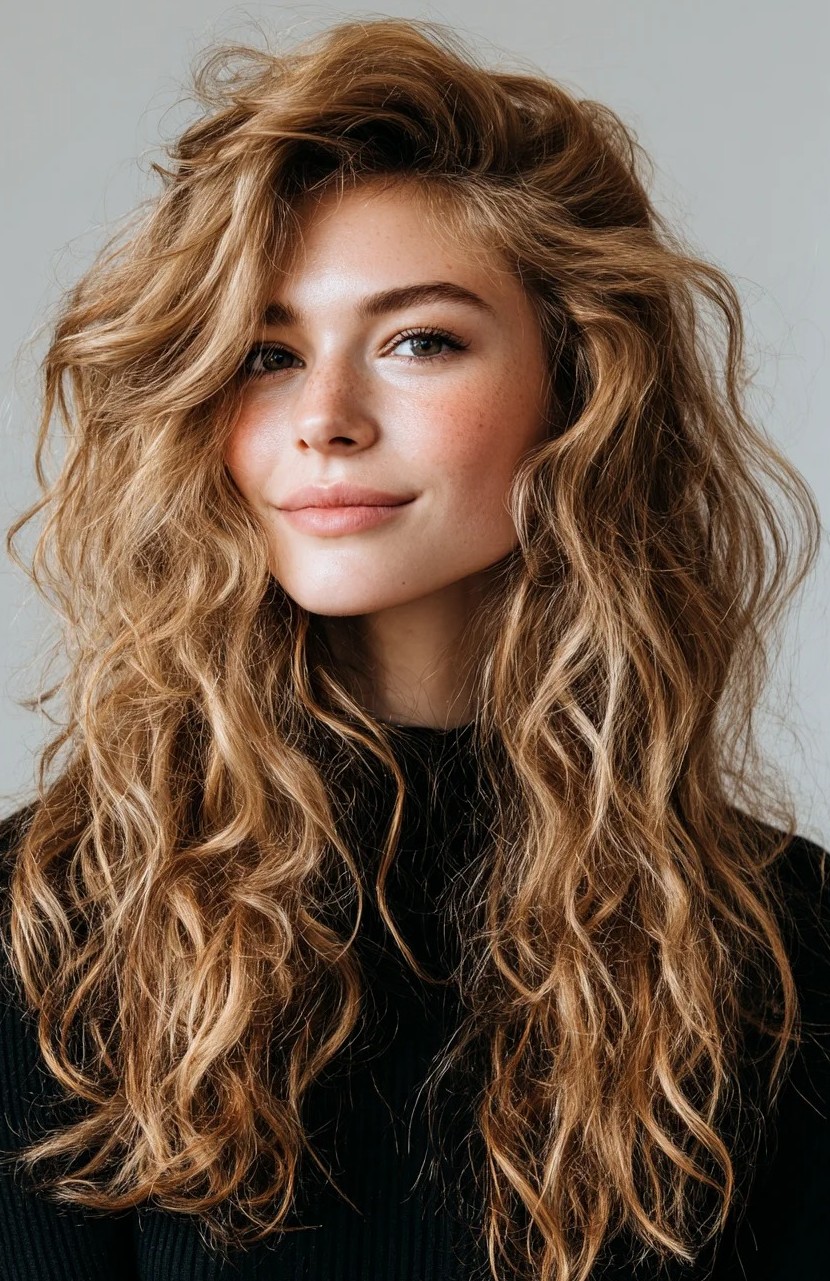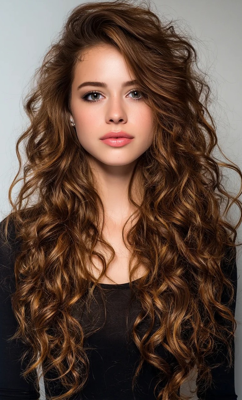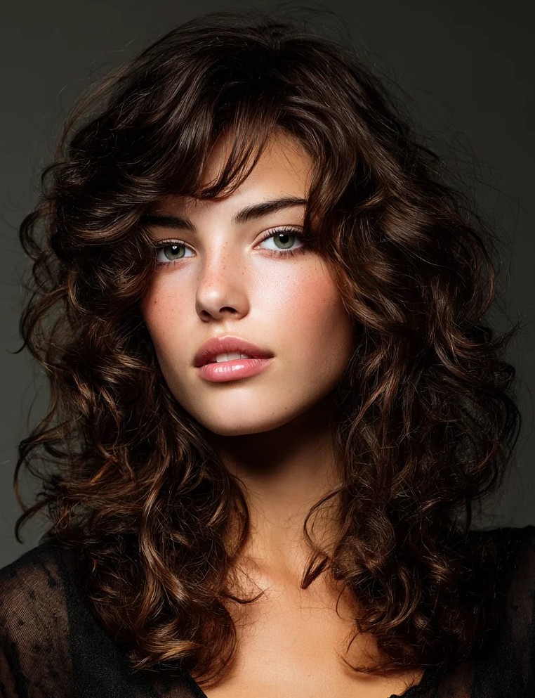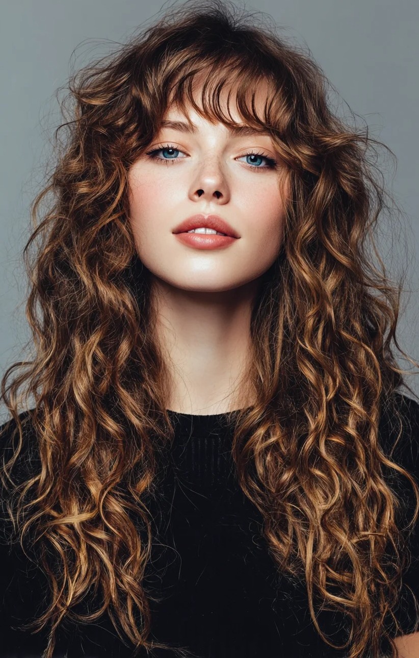 Soft, bouncy, and full of life, a long curly hairstyle with wispy curtain bangs is pure elegance with effortless charm. Loose curls bring natural movement and volume while delicate curtain bangs frame the face and highlight your features beautifully. Perfect for long hair, this style keeps curls lively, touchable, and never heavy. Whether for everyday vibes or special occasions, it blends playful texture with modern glamour.