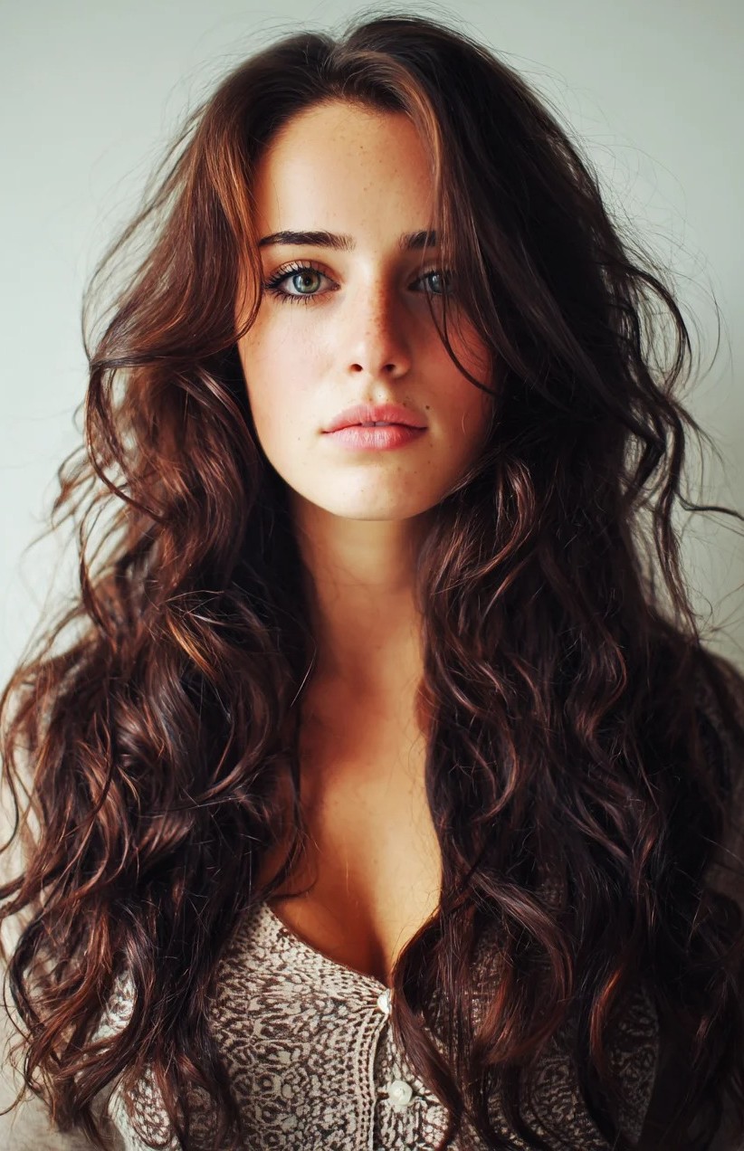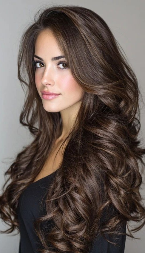 Soft, flowing waves create natural body while layered cuts enhance volume and prevent hair from looking flat or heavy. This hairstyle beautifully showcases highlights, balayage, or natural tones while giving long hair a sun-kissed look. This look combines effortless glamour with modern charm while making long layered hair appear beautifully textured.