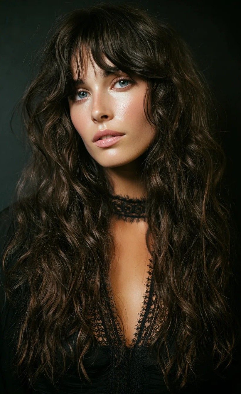 A long wavy hairstyle with side-swept bangs is the perfect combination of volume, movement, and modern elegance. Loose, flowing waves create natural texture and fullness while side-swept bangs gently frame the face and highlight your best features. Ideal for long hair, this style keeps waves lively, touchable, and effortlessly chic without feeling heavy.